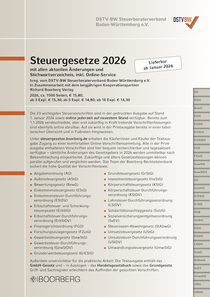 Sie können die aktuelle Ausgabe der Steuergesetzte zum vergünstigten Sonderpreis bei uns bestellen.